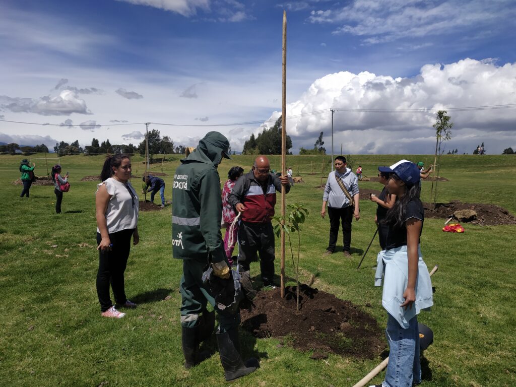 “La ingeniera Laura García, encargada de liderar los proyectos de arborización en Fontibón y Barrios Unidos, nos dijo que el objetivo era plantar 114 árboles de diversas especies en el parque, los primeros de un bosque urbano que se consolidará en la zona”.